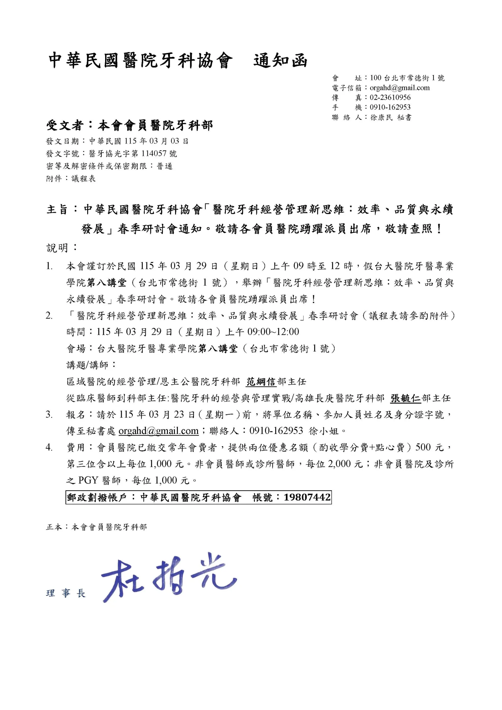 1.本會謹訂於民國115年03月29日(星期日)上午09時至12時,假台大醫院牙醫專業學院第八講堂(台北市常德街1號),舉辦「醫院牙科經營管理新思維:效率、品質與永續發展」春季研討會。敬請各會員醫院踴躍派員出席!