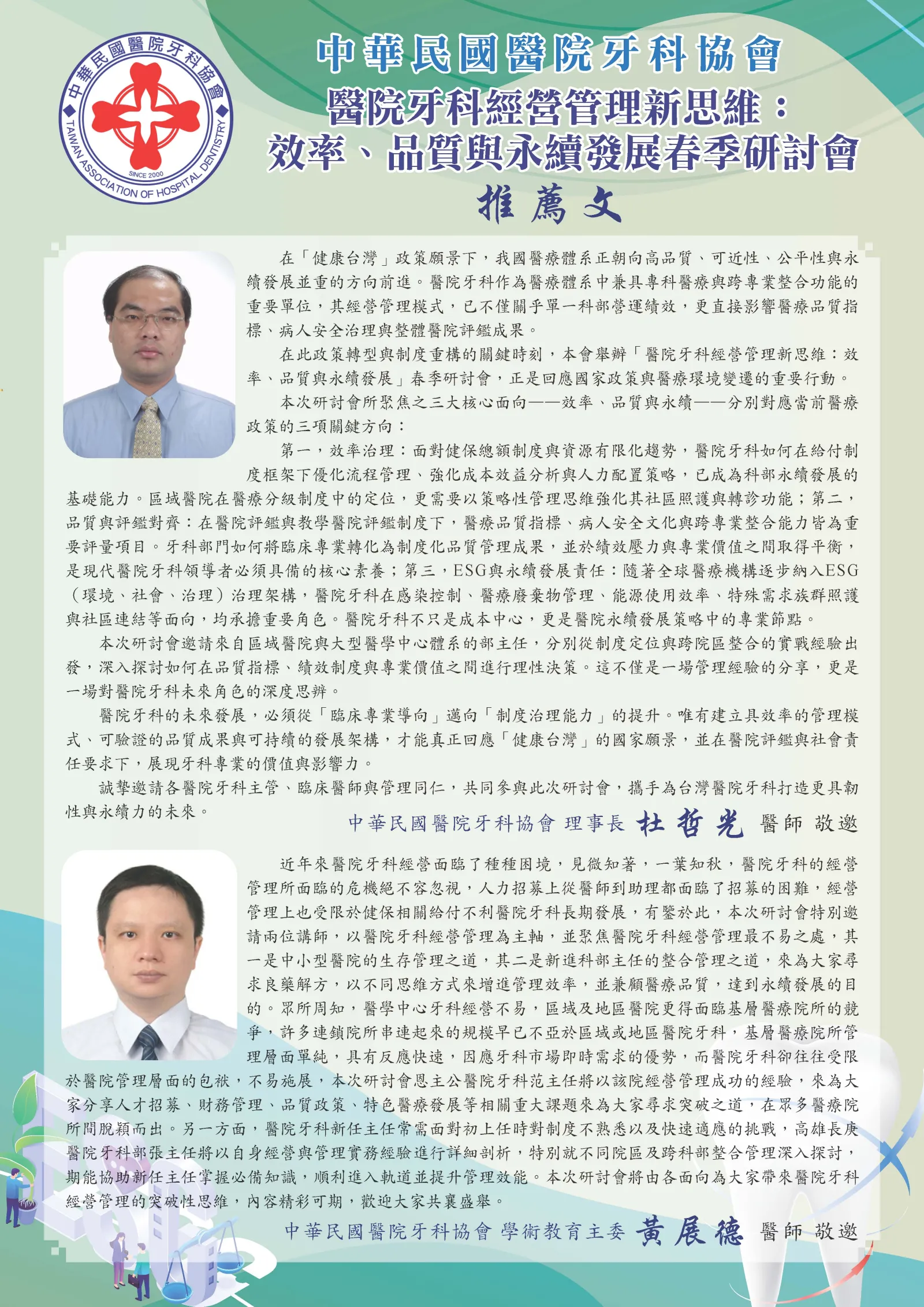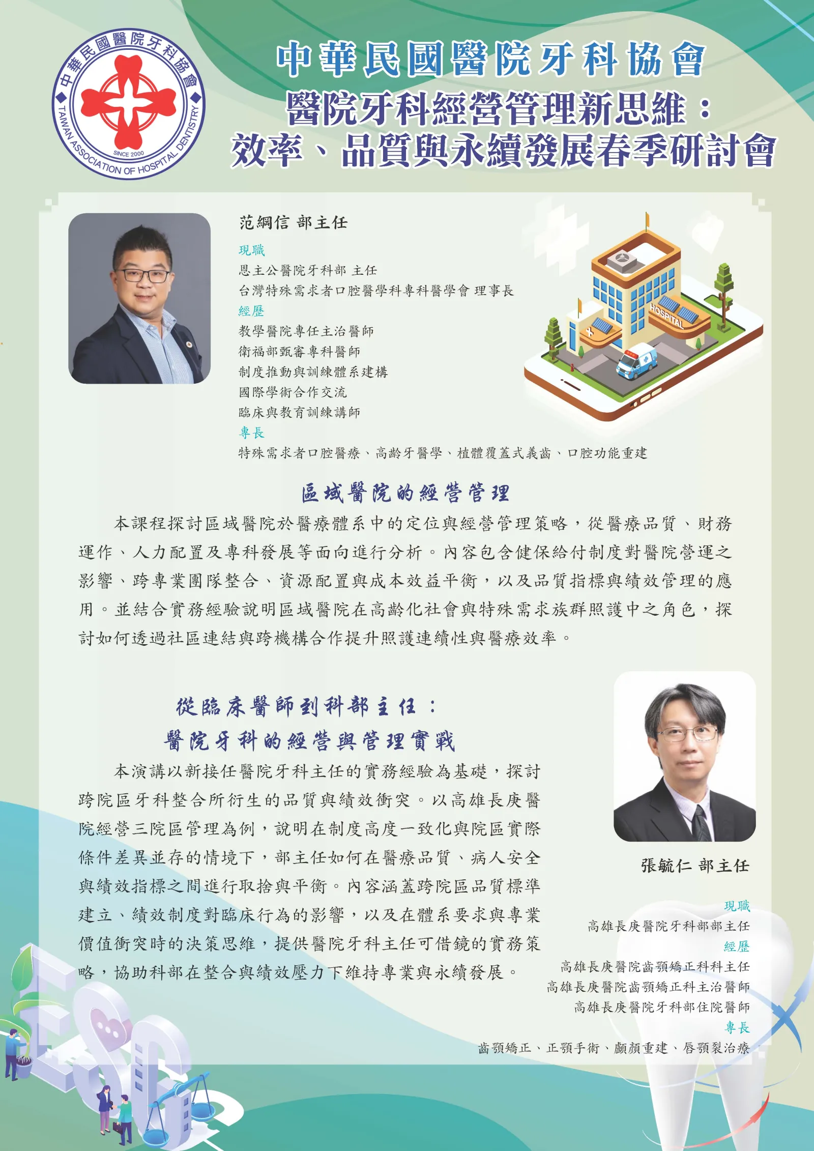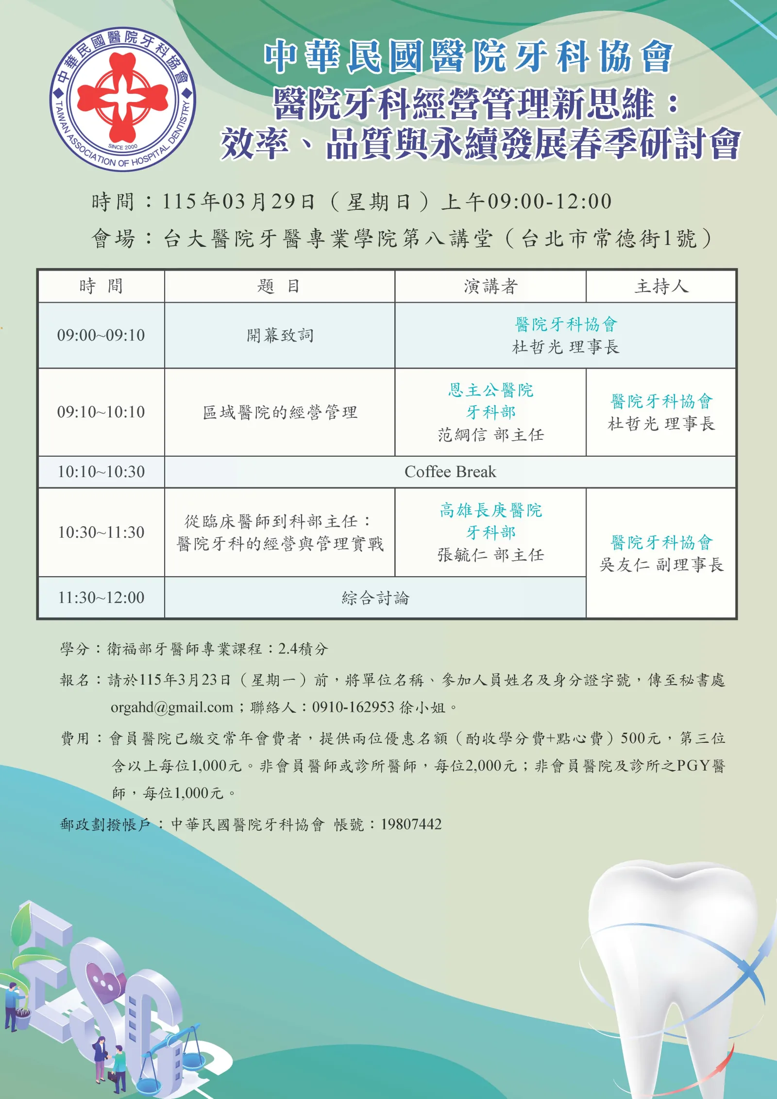 2.「醫院牙科經營管理新思維:效率、品質與永續發展」春季研討會(議程表請參酌附件)